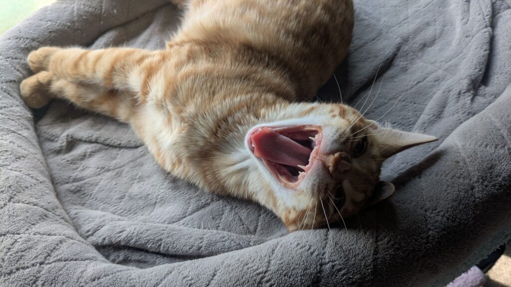 For the moment, they’re enthralled with a laser beam, although Pippin did just deposit her breakfast on top of the fridge.
