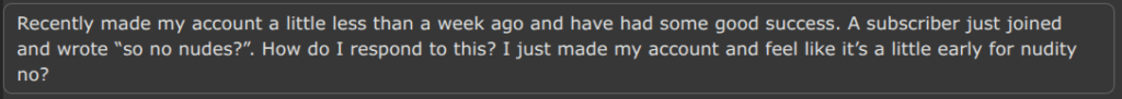 I trawled through the creator-focused subreddits. This week, it seems like they have been invaded by men who want to know if they can make it as creators. Most, if not all, are completely shocked to find out their subscriber-base will be men. Some of those guys will actually argue with the seasoned vets, I’ve researched this and women enjoy porn! Yes, we do, but we don’t usually go out and subscribe. If they’ve set up their account, they point to the followers with female profile pics as proof women are interested in their content. My man, I’ve been on the internet since ’95. I haven’t had a random woman follow and chat me up since ’98.