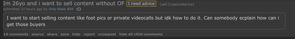 These brand new adults who can barely dress themselves sign up thinking they’re going to be rolling in cash because they posted their new pedi and told Greg from accounting he has a shrimp dick. Almost weekly, there’s a post from someone asking how to get started. Sometimes, rarely, they come with specific questions, like why does Onlyfans need my Facebook account, or how can I keep my family from finding out? More often, however, they post shit like this.