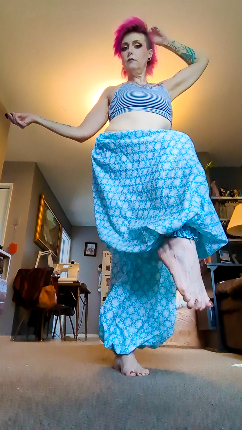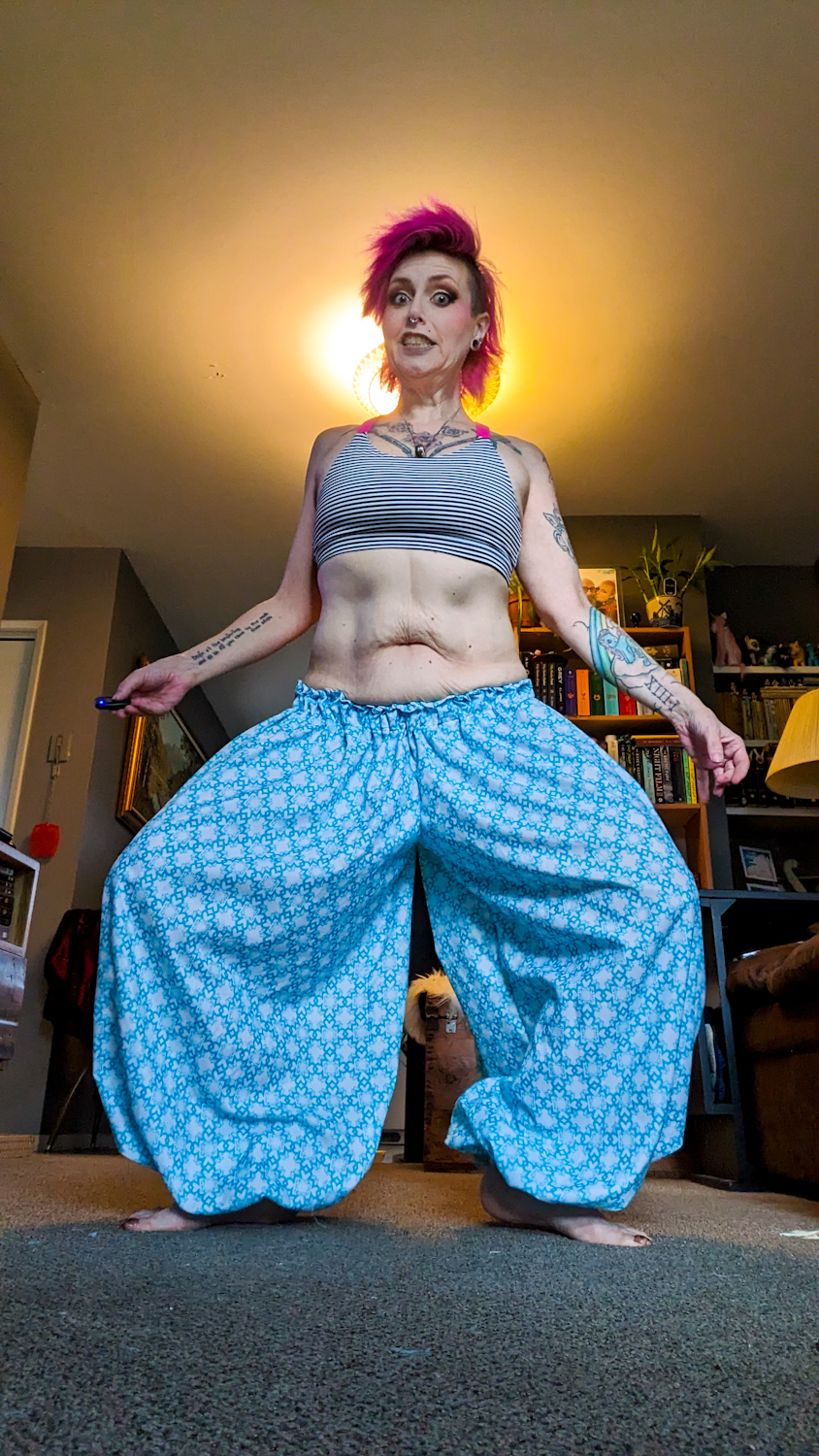 The blue pair is a new pattern. WE HAVE LEGS, Y’ALL. I wasn’t too worried about fucking it up and wasting fabric. The print isn’t really my jam, and the fabric is the cheapest stuff you can find in the kids’ bedding line at Walmart. I was super stoked with how quickly they worked up. They turned out really nicely for my first try making something with actual legs. Now I have two options, which is awesome.