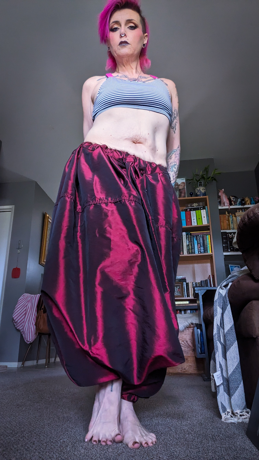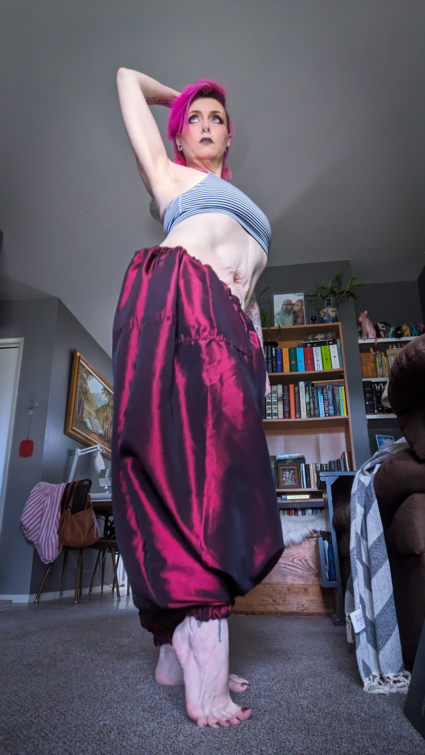 I made the red pair from a curtain panel. I used my regular pattern, which is like wearing a sack with foot-holes. The panel was about 5″ wider than usual, because if I don’t need to cut shit, I’m not going to cut shit. This added 10″ to the already enormous waistline, but made everything extra billowy in the “sack”. This was my second foray into a proper waistband, which meant I needed to pleat shit. I put pleats in the waist, then added some smaller ones in the “crotchal region” to tighten everything up and keep it from hanging too low and tripping me.