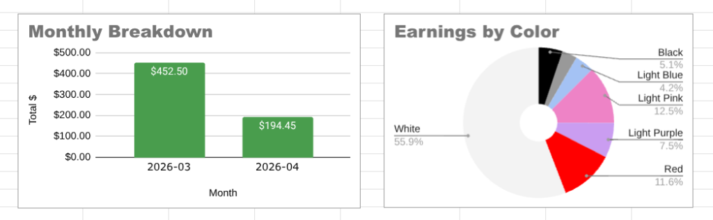 I’ve been fucking with a spreadsheet to track my Chaturbate shit. While it’s not as in-depth as Audrey was, it’s still been a learning experience. I haven’t really messed with spreadsheets since high school. Even then, I didn’t do much more than build basic shit, like employee lists and time sheets. This little project tracks things like followers, earnings, and my “look”.